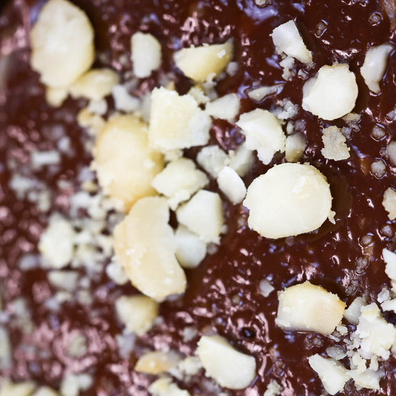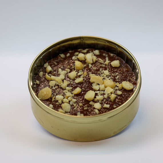 Dark Belgian Chocolate mixed with our gourmet caramel, with just the right amount of coconut, topped with delicious macadamia pieces.